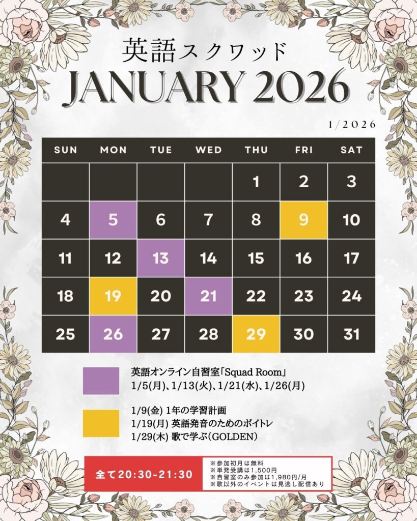 さて、2026年1月の英語スクワッド!3つのイベントと4回の自習室を予定しています。