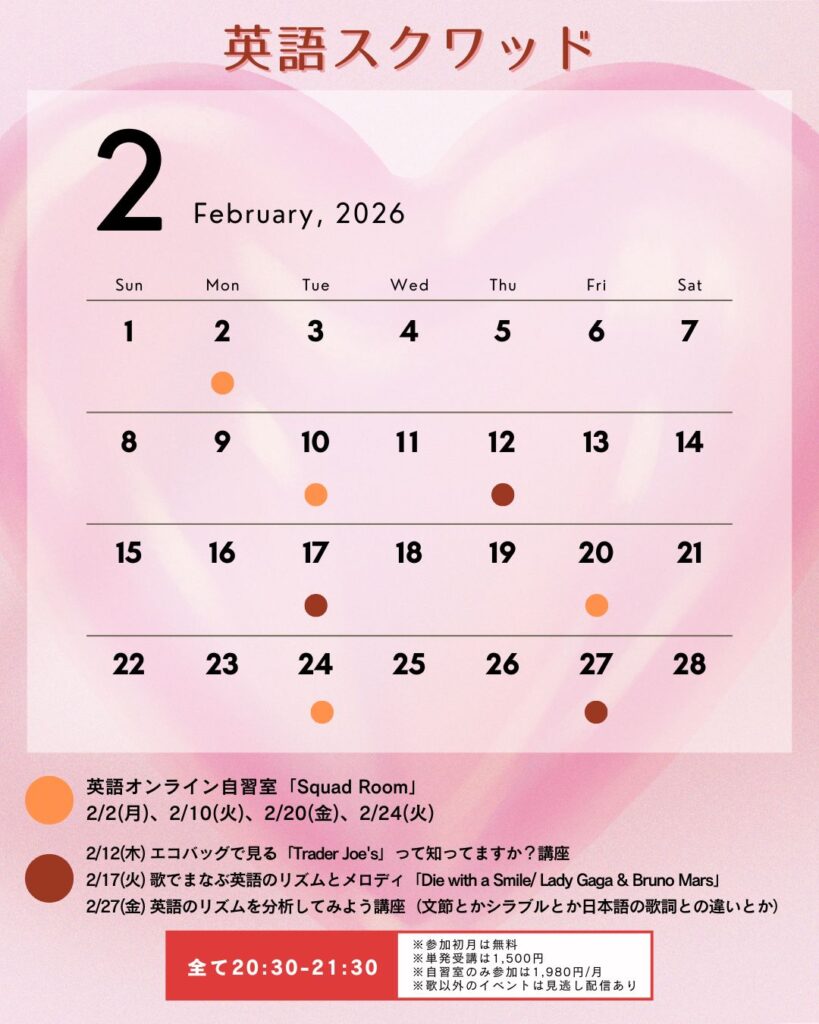 【英語スクワッド 2026年2月の予定】今月は「みんな持ってるエコバッグ」でお馴染みのクセ強オーガニック系スーパー Trader Joe’s の話をし、バレンタイン月なのでLady Gaga & Bruno Marsのデュエット「Die with a Smile」を歌い、私なりの「英語のリズム考」をご紹介します。