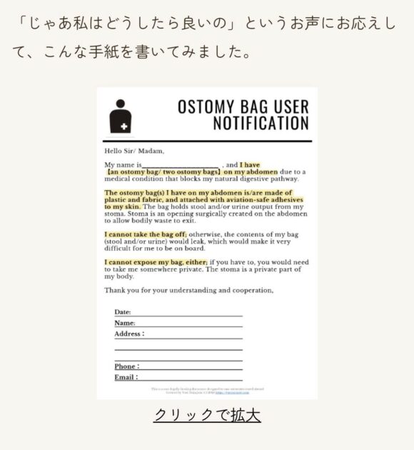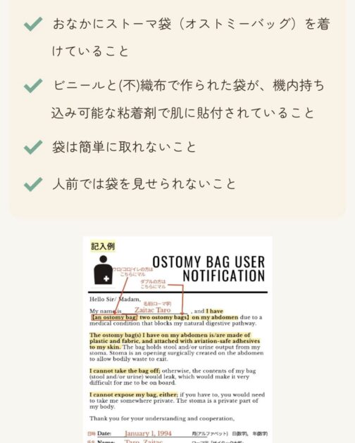 初回は私の飛行機旅行経験にプラスして、海外の空港保安検査員に渡せる「おなかの袋の説明書」英語版を作成しました。